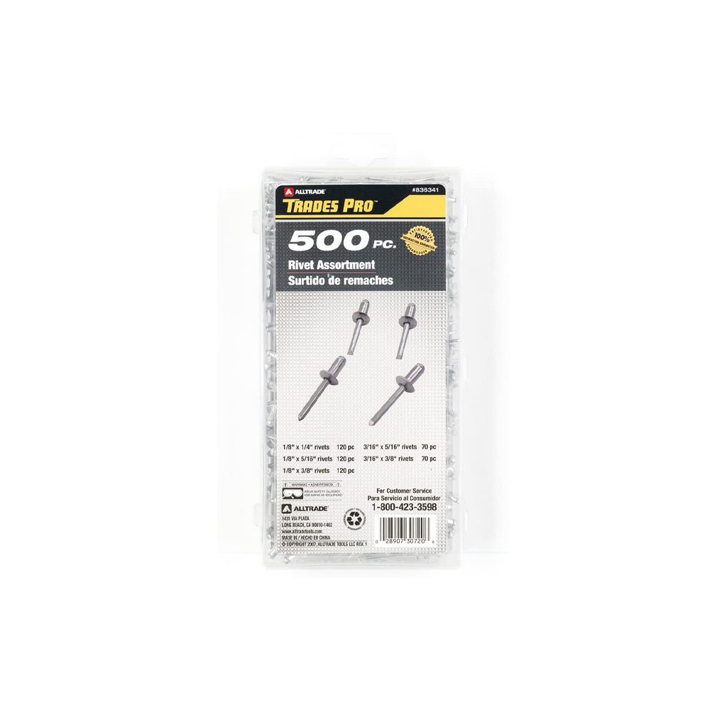 The Tradespro Aluminum Rivet Assortment is a great value to get an array of rivets without going through the trouble of getting each size individually. All of the rivets are made of aluminum, which makes it a lightweight rivet while still holding up with its integrity. The storage case keeps all of the rivets organized and clean, so you can tuck it away and pull it out whenever you need it to find the perfect rivet you need. You can use this at any time around the home or when you are on your worksite.