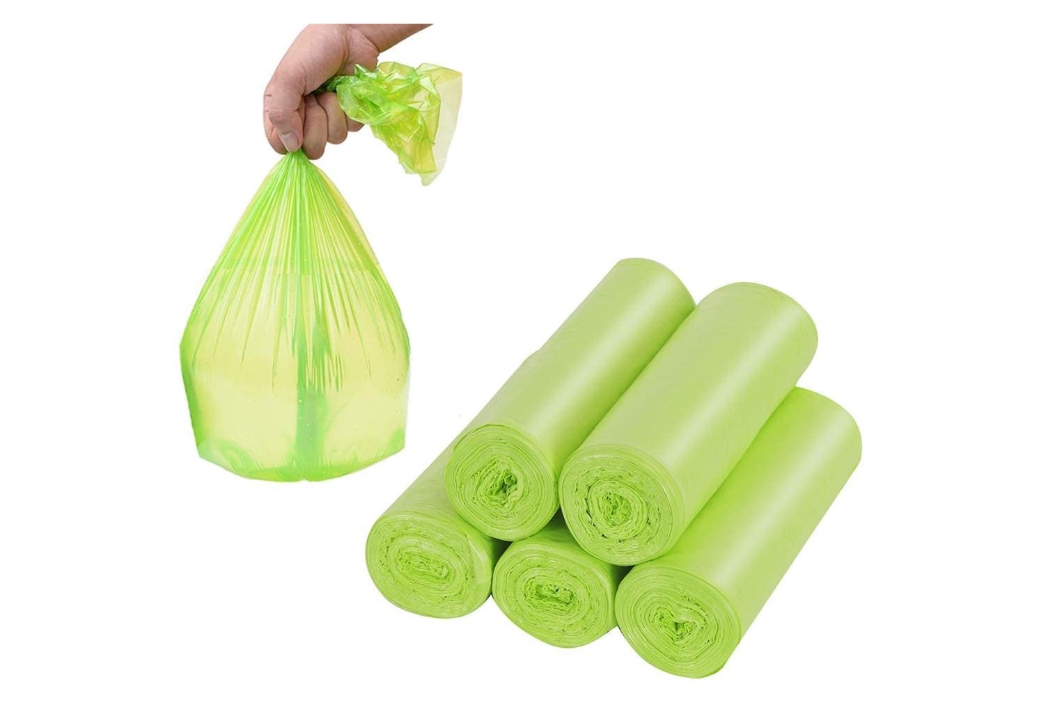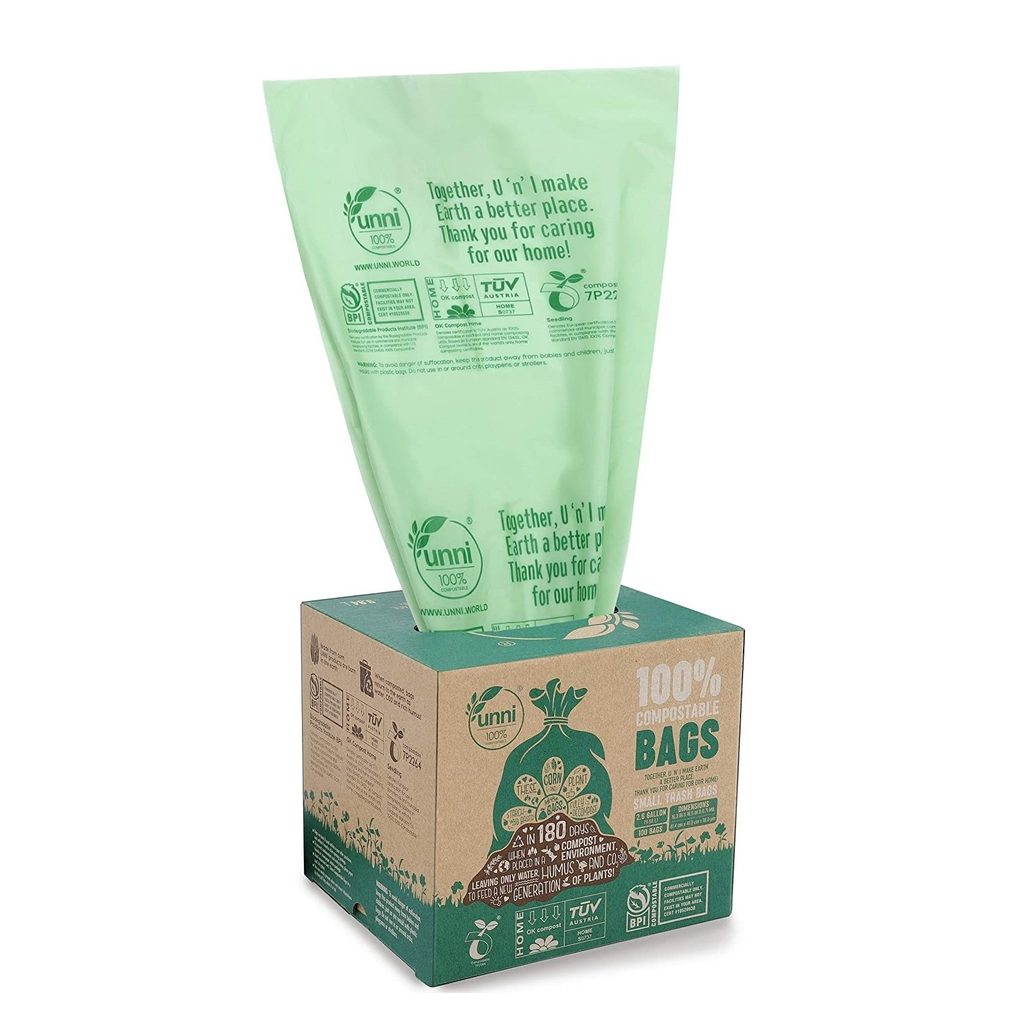 With UNNI’s trash bag set, you get 100 trash bags that can hold up to 2.6 gallons of trash each. This smallish size makes it ideal for food scrap bins in the kitchen or for composting. The bags are made of plant starches and are best used within a year of your purchase.
