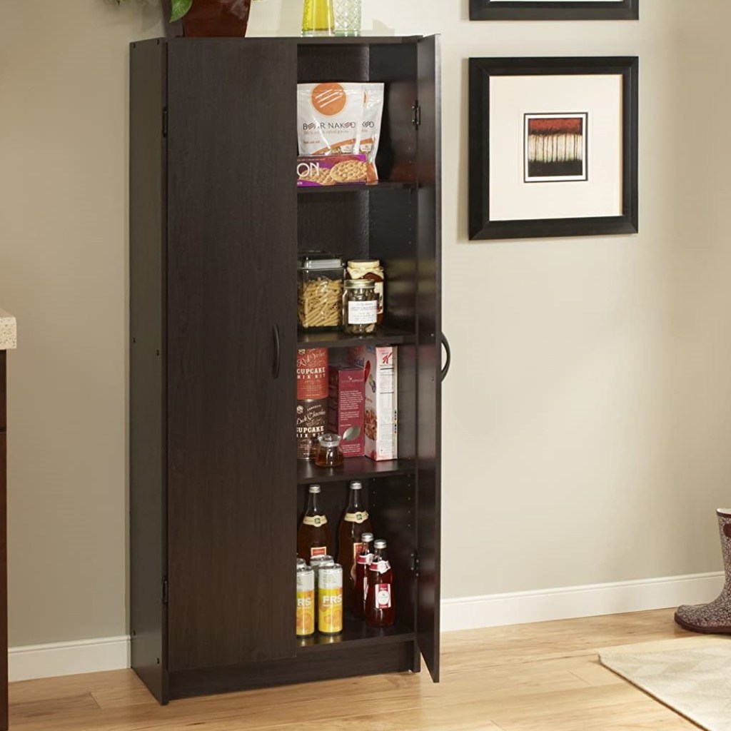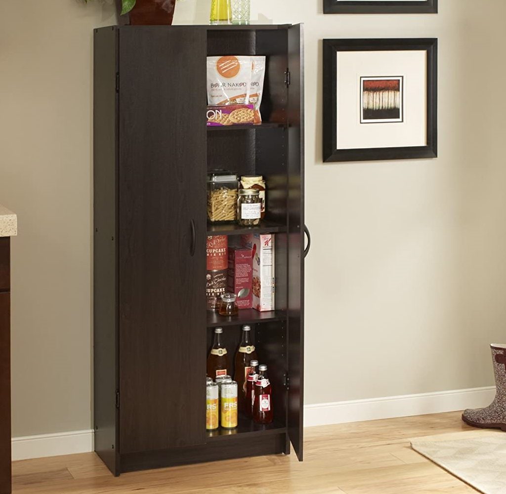 The ClosetMaid Cabinet is the best broom closet alternative. The double doors cover four shelves where you can store cleaning supplies, office supplies, and other small items. This cabinet is small enough to tuck away if you have a small work space, but need tall storage. Note that some assembly is required.