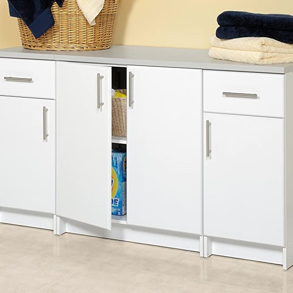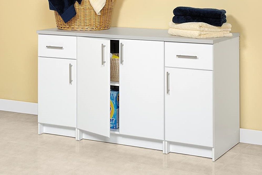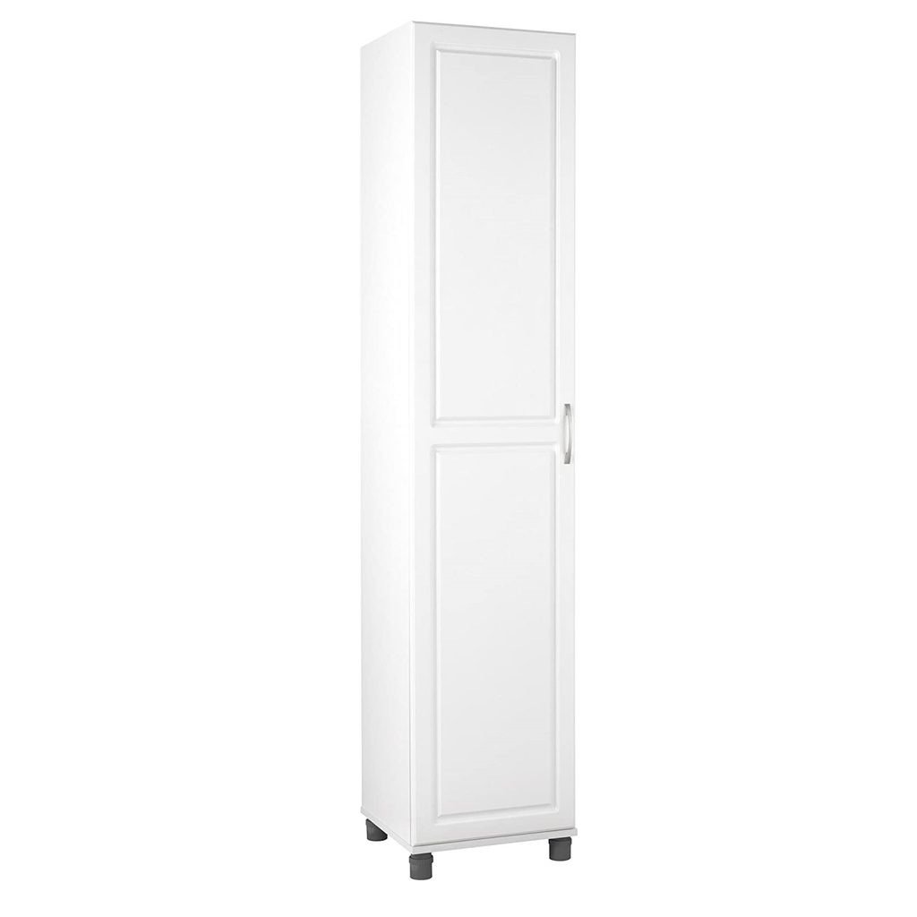Prepac’s white cabinet wins the best in aesthetic and functional design. Its narrow width and tall height allow you to seamlessly integrate it into your existing work space. The interior has room to store long brooms and tall items, while two smaller shelves accommodate other items.