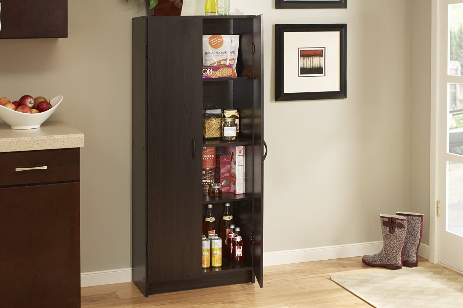 Prepac’s white cabinet wins the best in aesthetic and functional design. Its narrow width and tall height allow you to seamlessly integrate it into your existing work space. The interior has room to store long brooms and tall items, while two smaller shelves accommodate other items.