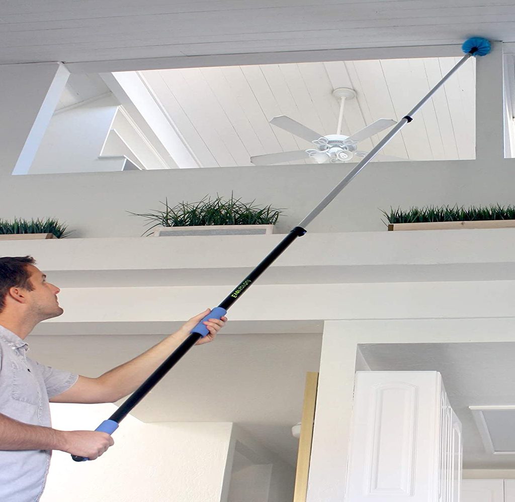 Ettore’s cobweb duster utilizes electrostatic action with its plastic bristles and cleans all types of surfaces like walls, ceilings, and window screens. However, it is best used for high-ceiling corners and crown molding. The steel handle lengthens to 9 feet.