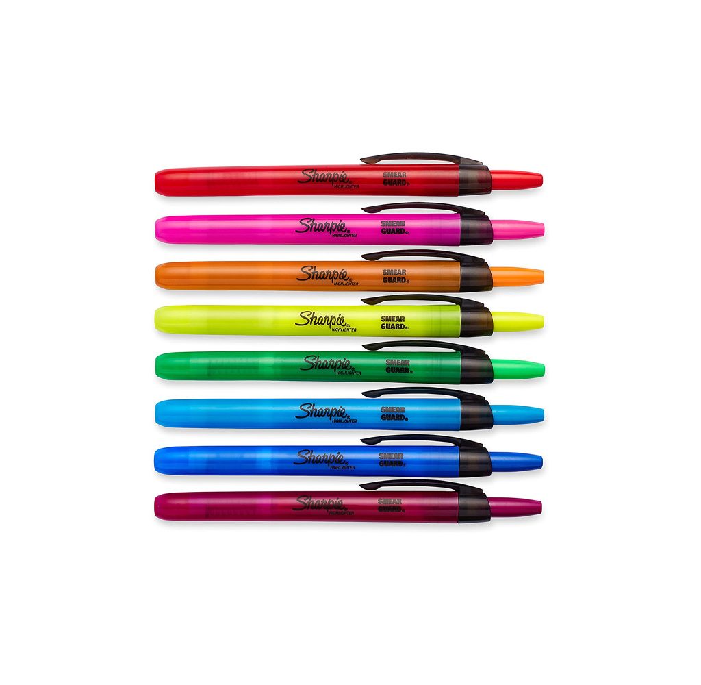 With eight vibrant colors, the Sharpie Accent Retractable Highlighters feature a retractable chisel tip that glides easily and won’t bleed through most paper. Just click and mark your important notes for efficient study sessions or to emphasize the most important data to access info easily. With no cap to lose, these markers will last longer without drying.