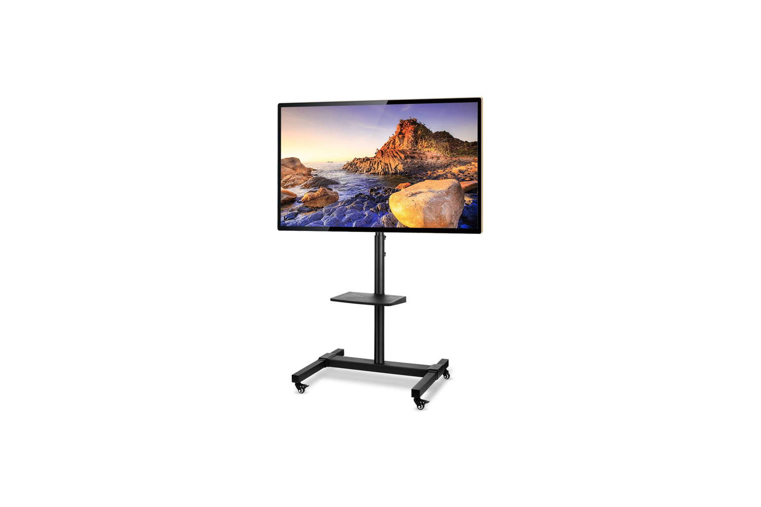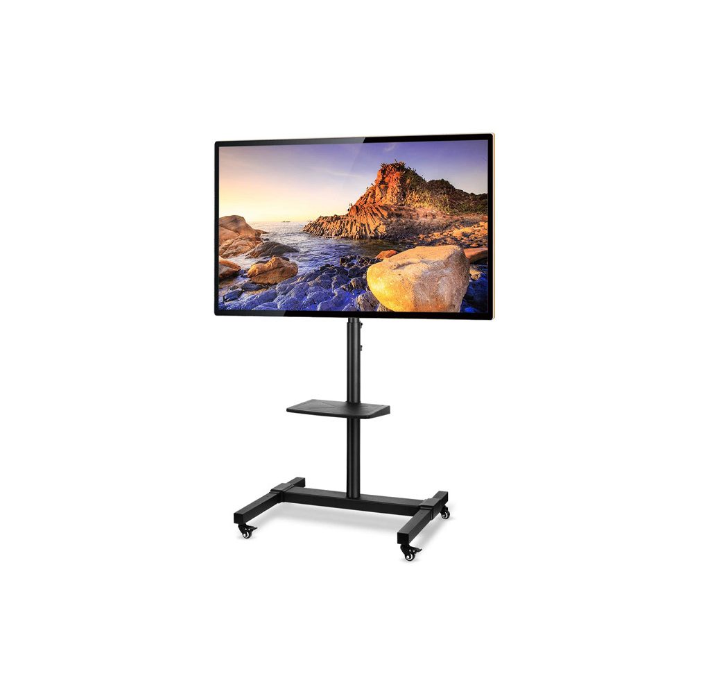 If you are one who needs to have a moveable implement for your TV to be mounted on, look no further than the 5Rcom Mobile TV Cart with Wheels. Its adjustable height makes it perfectly flexible for your home. The mobile TV stand is compatible with most TVs that range from 36 to 72 inches. The metal is coated with a black powder finish, so it can fit into any location you wheel it to. The wheels can move in all directions, and the front wheels lock for stability. It is a great alternative to those who cannot use wall mounts for their TVs.