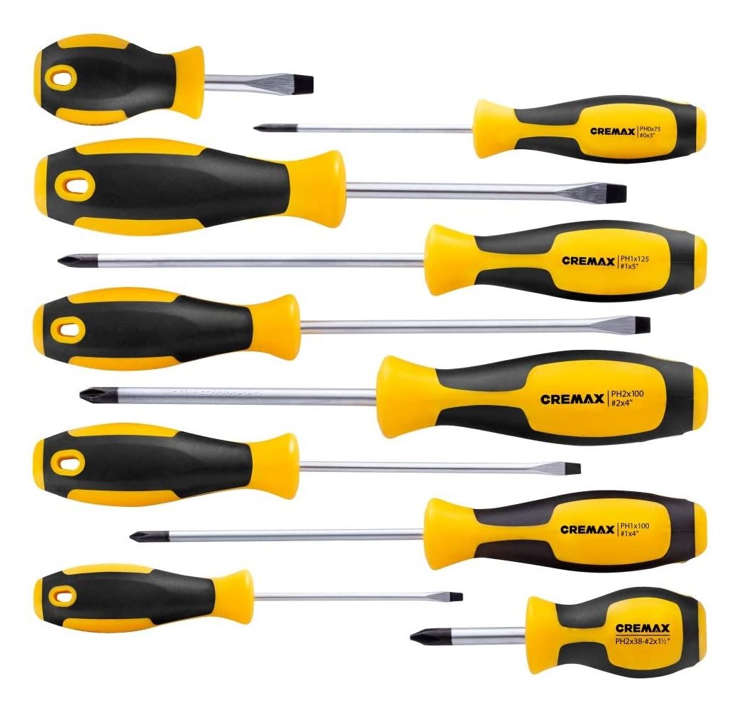 The CREMAX screwdriver set is a 10-piece kit designed for basic household use. You’ll get the standard screwdriver tips you need in a chromium-vanadium steel coating that resists both rust and corrosion. Magnetized tips hold screws in place as you work, while comfort grip handles give you plenty of power and control. Each one includes a printed size for easy identification along with bright handles.