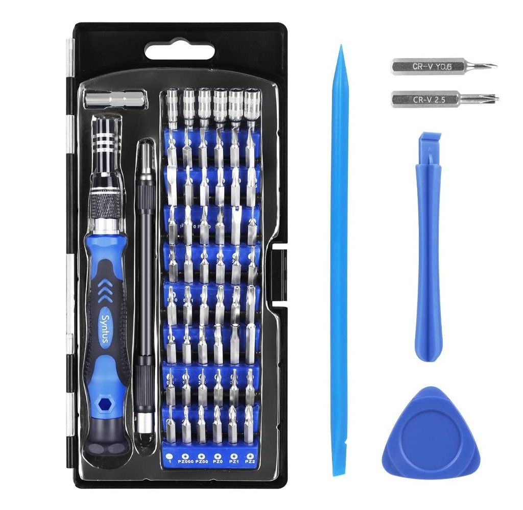 Syntus’ kit includes everything you need for electronics repair with a convenient 57-piece tool kit in a carry case. It includes uncommon bit types for security screws, and each bit uses steel for rust and corrosion resistance. A sturdy handle gives you finger control, while molded slots keep everything organized and right where you need it. The ball-bearing swivel top makes bit changes fast and simple.