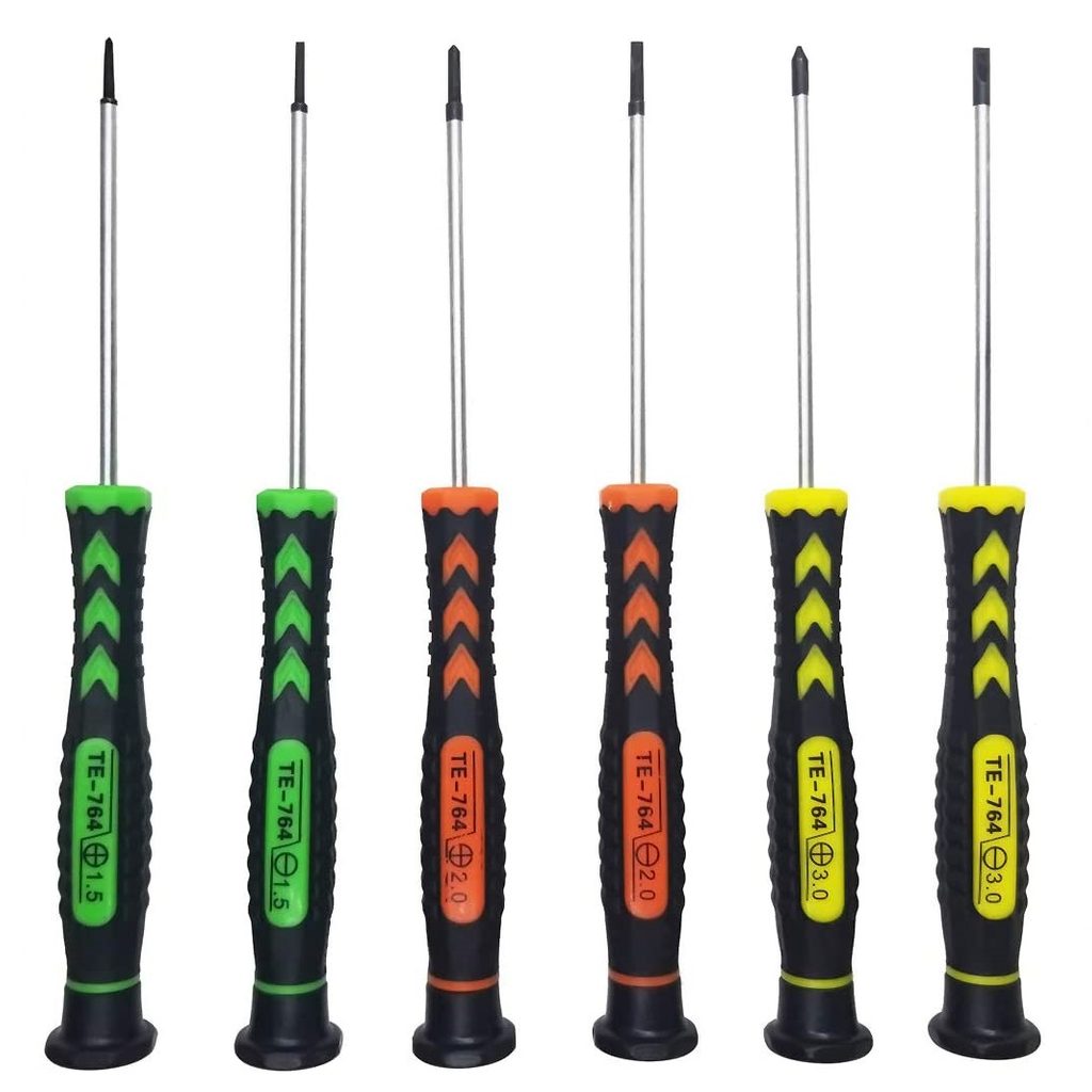 M-jump includes six common electronics screw types in its mini set. Each one has magnetic tips, a comfort grip handle, and flat bottoms. Its coated steel is durable and resists rusting, while the connections are sturdy and allow better finger control. Plus, the ergonomic design makes it easier to hold while working. Clear labels ensure that you always have the screwdriver you need.