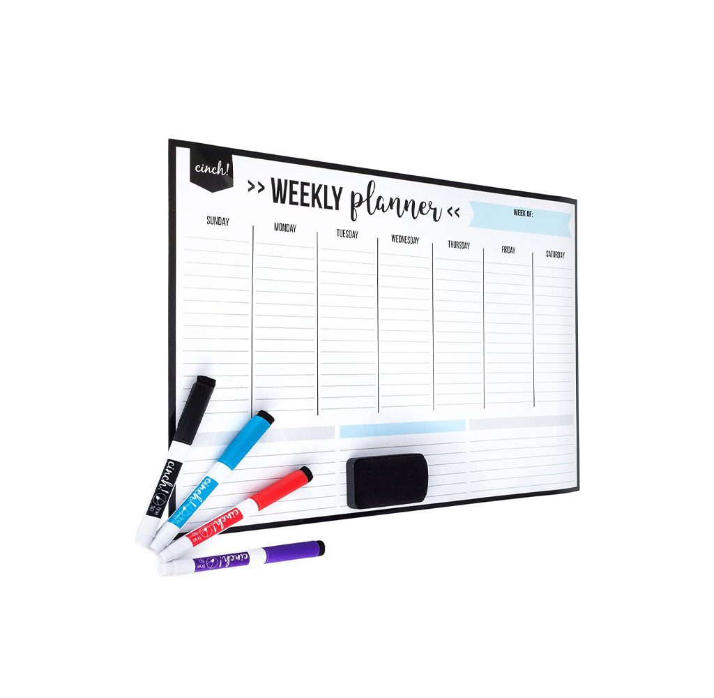 Stay on top of your dates and appointments with the cinch! Weekly Calendar Dry Erase Board. Designated columns for each day of the week and miscellaneous notes at the bottom allow you to plan your week neatly. The surface cleans easily with the provided eraser.