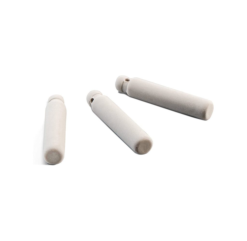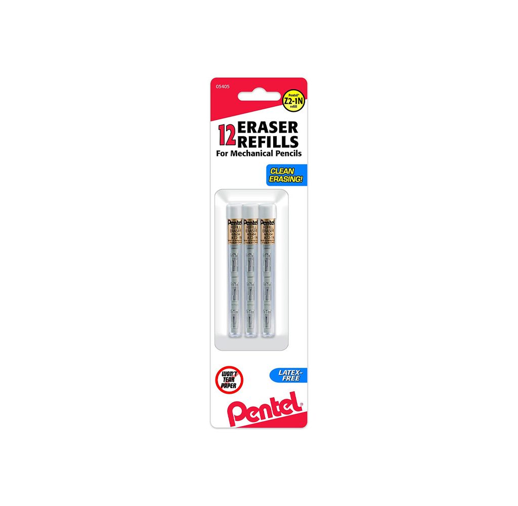 Provided in this set of Pentel Mechanical Pencil Eraser Refills are three tubes that hold four eraser refills each. The white erasers are enclosed in a metal casing. A big feature of this design is that the entire eraser cannot be used up. These erasers are latex-free, and they erase pencil markings completely and without leaving a mark.