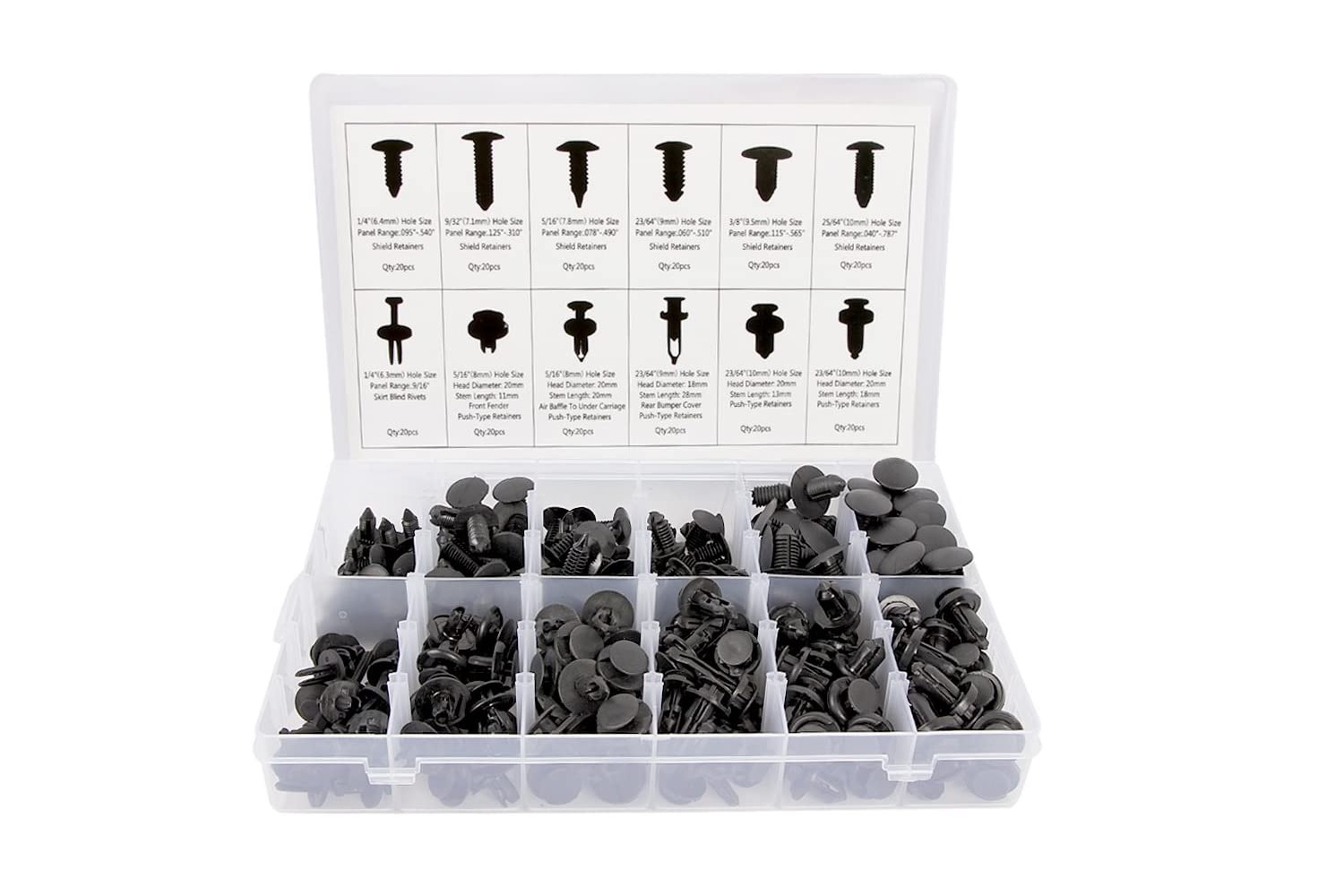 It can be difficult to keep track of all of those plastic rivets, and when they are all the same color, it is even more important to find ways to separate them by size and type, so you will know exactly what you have. The SunplusTrade Push Type Retainer Clips give you that compartmentalized box for each retainer kit to stay organized. It also comes with a cheat sheet that will let you know about the rivet size and type.