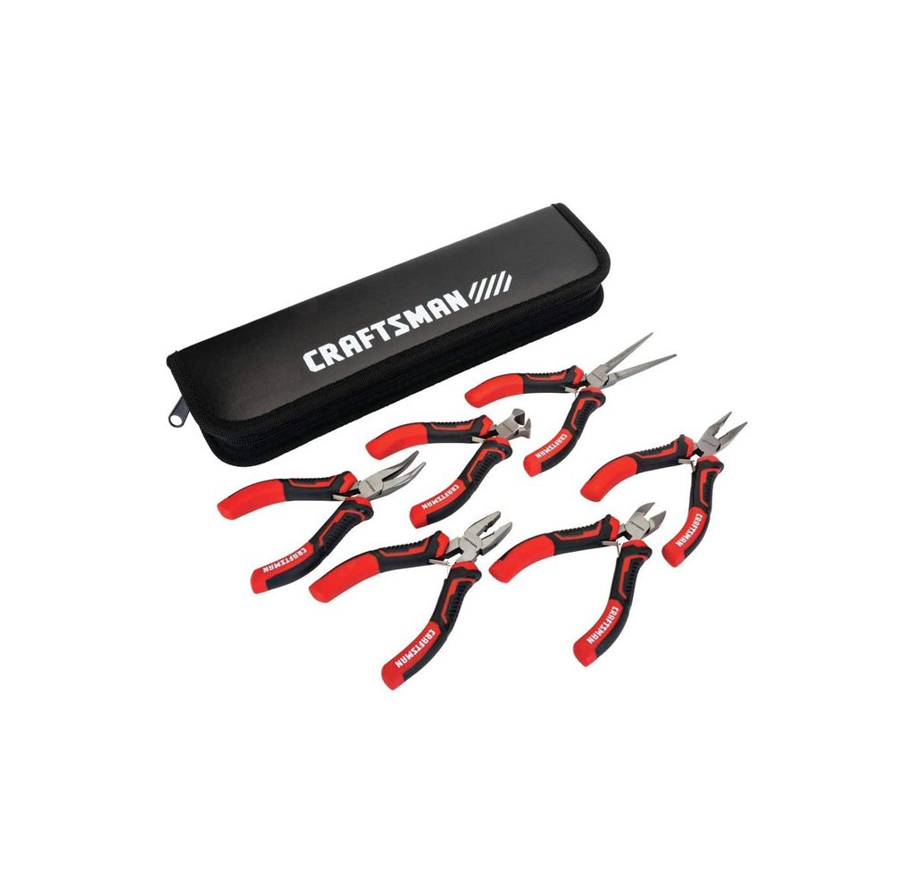 This plier set from Craftsman includes six different pliers. If you want just one kit, this is the one to get. The mini sizes make them comfortable for smaller jobs, like jewelry, electronics, and metal wiring. The drop-forged steel they’re made of makes them especially strong.