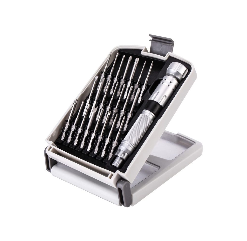 Nanch’s set offers 22 different precision screwdriver bits with antislip materials and corrosion-resistant coatings. Each bit fits into an organized case that allows you to transport everything safely. The weak magnetic charge enables you to keep track of small parts without damaging or losing them. The set is compact and designed to make transport easier.